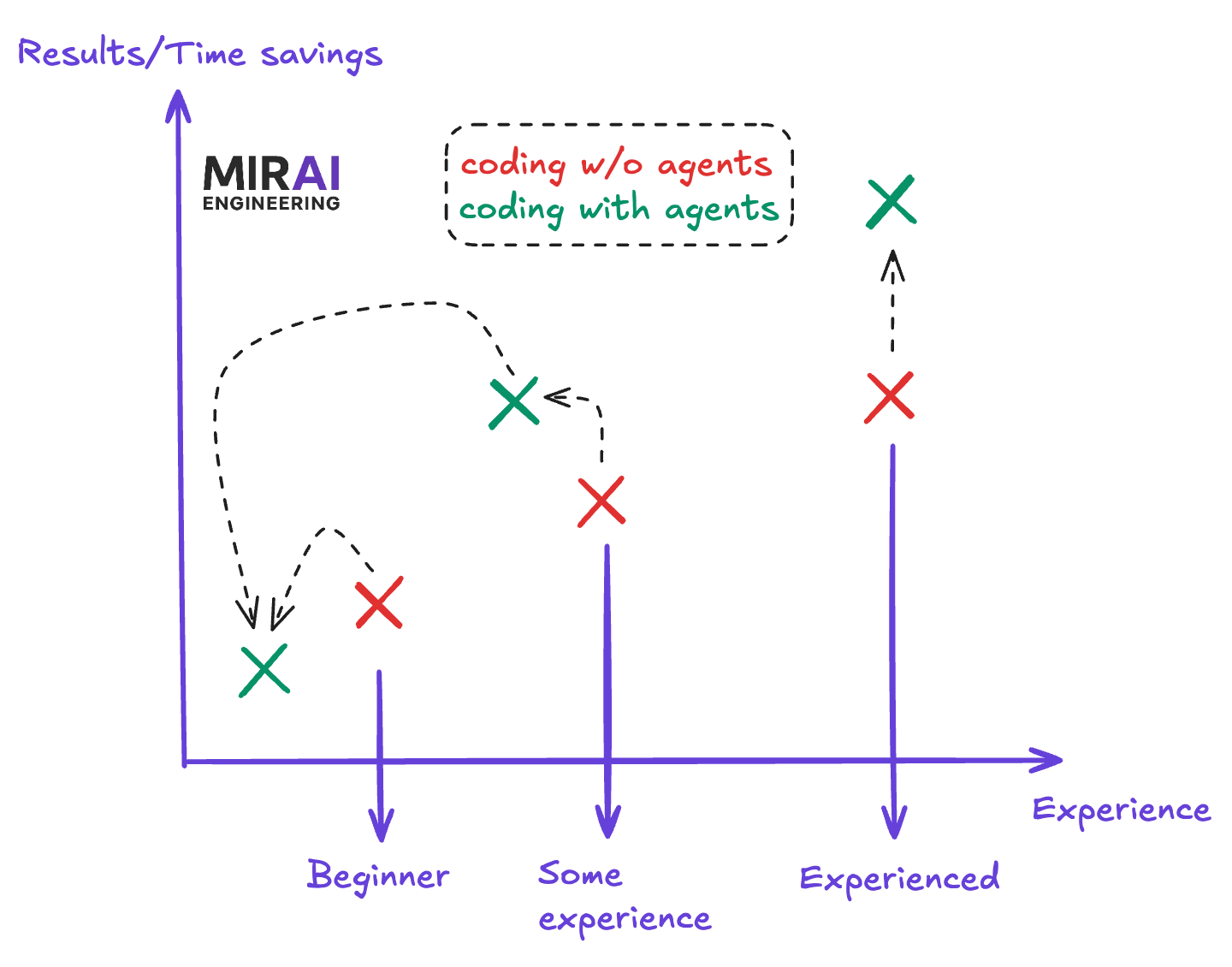 See the pattern? Beginners using agents without guidance get worse results than beginners coding from scratch. They're vibe-coding. But experienced engineers using agents with clear direction? The time savings skyrocket. Because they're not replacing their thinking, they're amplifying it.
